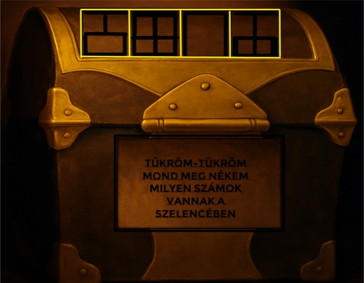 A gondolában egy érdekes ládát találtok, a tetején különös alakzatok vannak és egy üzenet: tükröm-tükröm mond meg nékem milyen számok vannak a szelencében ?