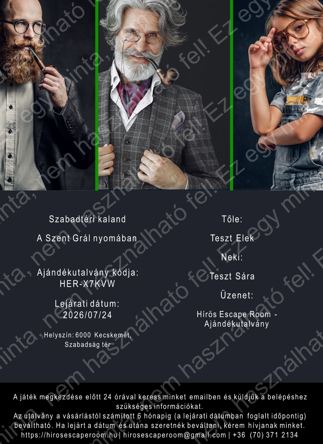 A Hírös Escape Room – Szabadtéri kalandok ajándékutalványait online el tudja készíteni, mindössze 3 lépésben. A vásárlás biztonságos fizetési kapun keresztül történik. Minden utalvány 6 hónapig felhasználható, a vásárlástól számítva. Az utalványt fizetés után küldi ki rendszerünk.